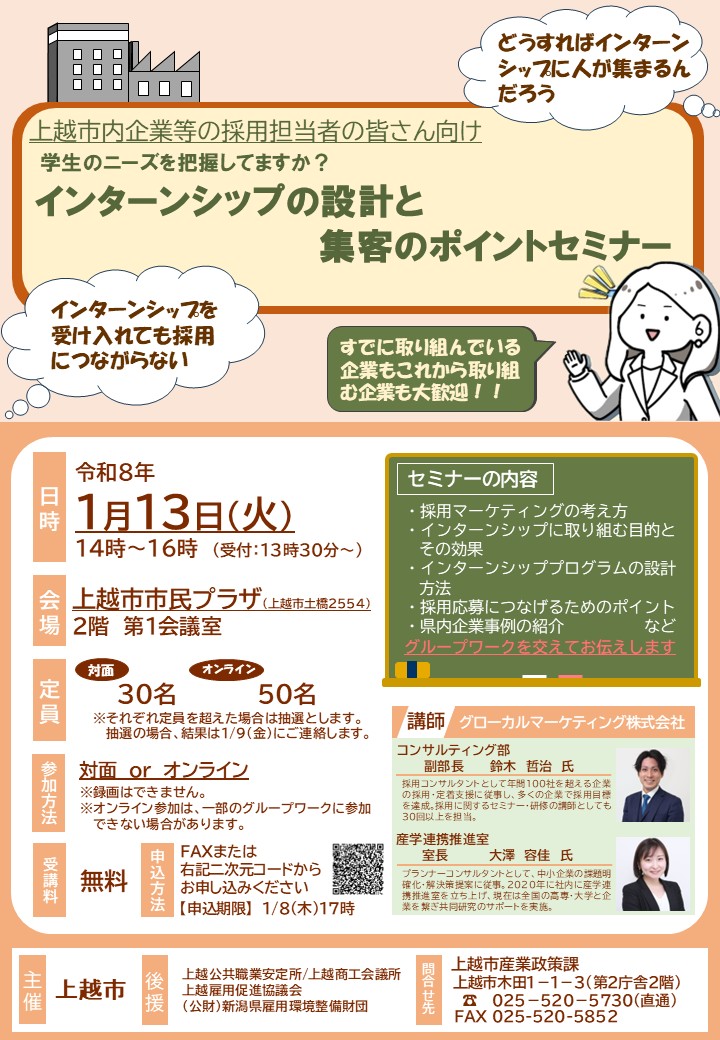 上越市では、上越市内企業等の採用担当者の皆さんを対象に、インターンシップの設計と集客のポイントに関するセミナーを開催します。