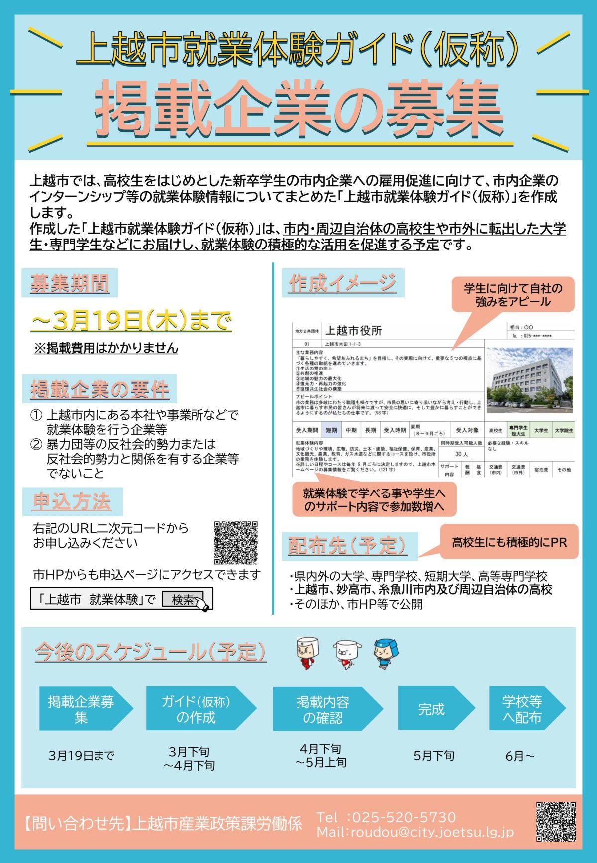 「上越市就業体験ガイド(仮称)」掲載企業を募集しています