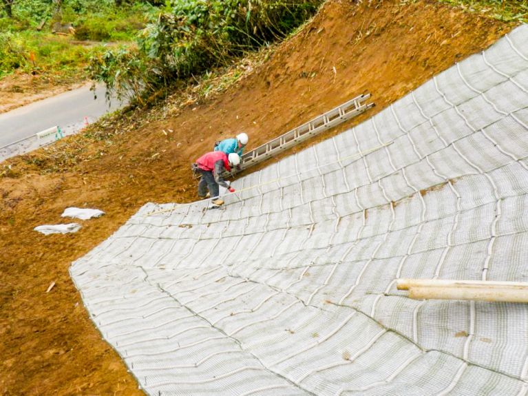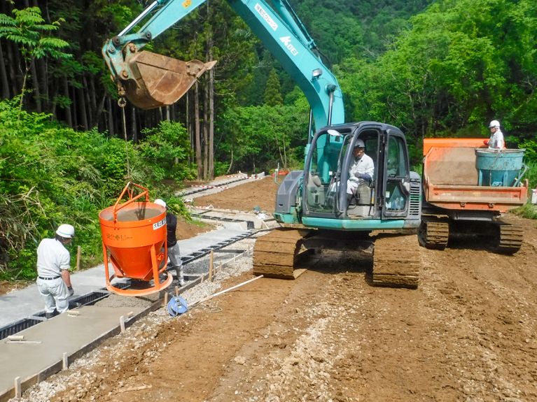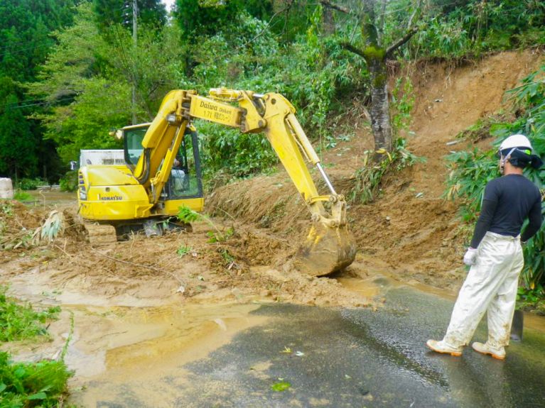 道路災害が発生した場合、崩壊した斜面の土砂を撤去するところから、道路清掃、斜面保護植生マットを設置して安全に通行できるところまで行います。