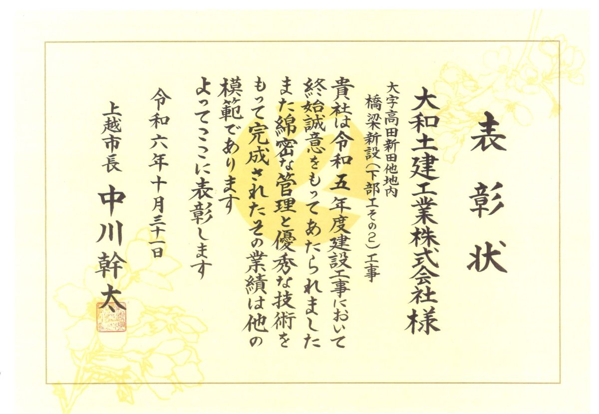 これもひとえに、工事に携わってくださった関係各社の皆様、地元関係者の皆様のご協力のおかげです。令和5年度も各工事で、上越市から優良工事表彰と優良建設技術者表彰をいただく事が出来ました。