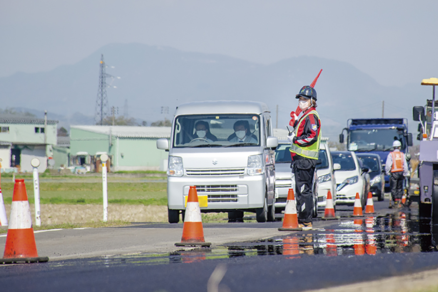 当社は道路工事現場を中心とした「交通誘導警備業務(警備2号業務)」が主な事業です。歩行者や一般車両はもちろん、現場や作業員、工事車両の動きも把握し、通行と工事が滞りなく行われるよう心がけています。