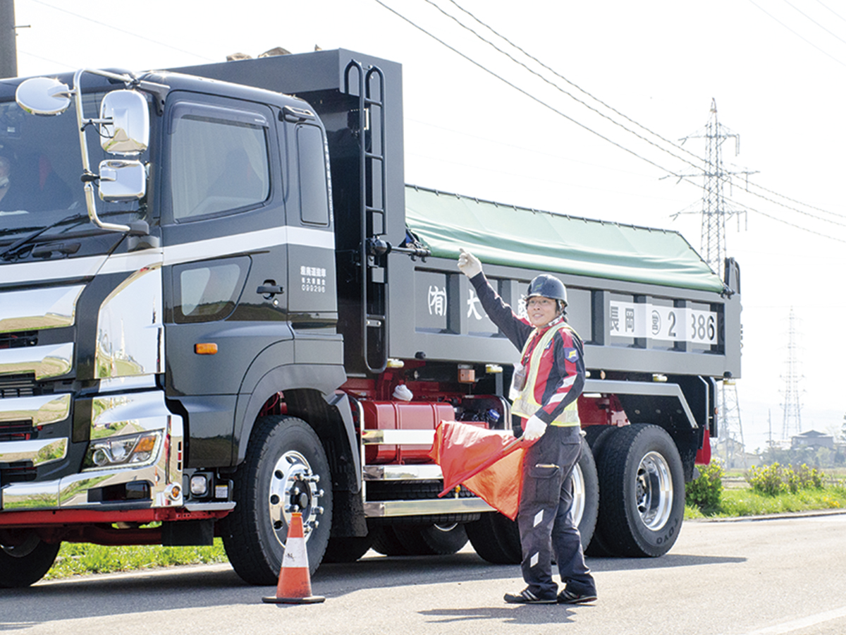 現場作業が円滑に進むよう、工事車両の出入りを誘導し、作業者の安全に注意を払います。工事車両が動く時には、まず第一に歩行者や一般車両の安全を確保します。